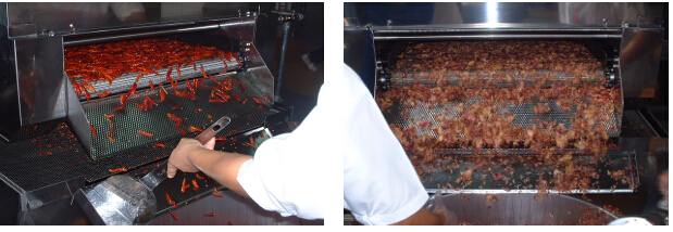 运送的产品在油炸机中用中央的回转搅拌,防止油炸不均匀的情况发生。