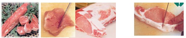 除去里脊肉的薄皮及筋;把肉切成¢4cm×2cm厚(30g)的肉块,把把肉与脂肪之间的筋切除。