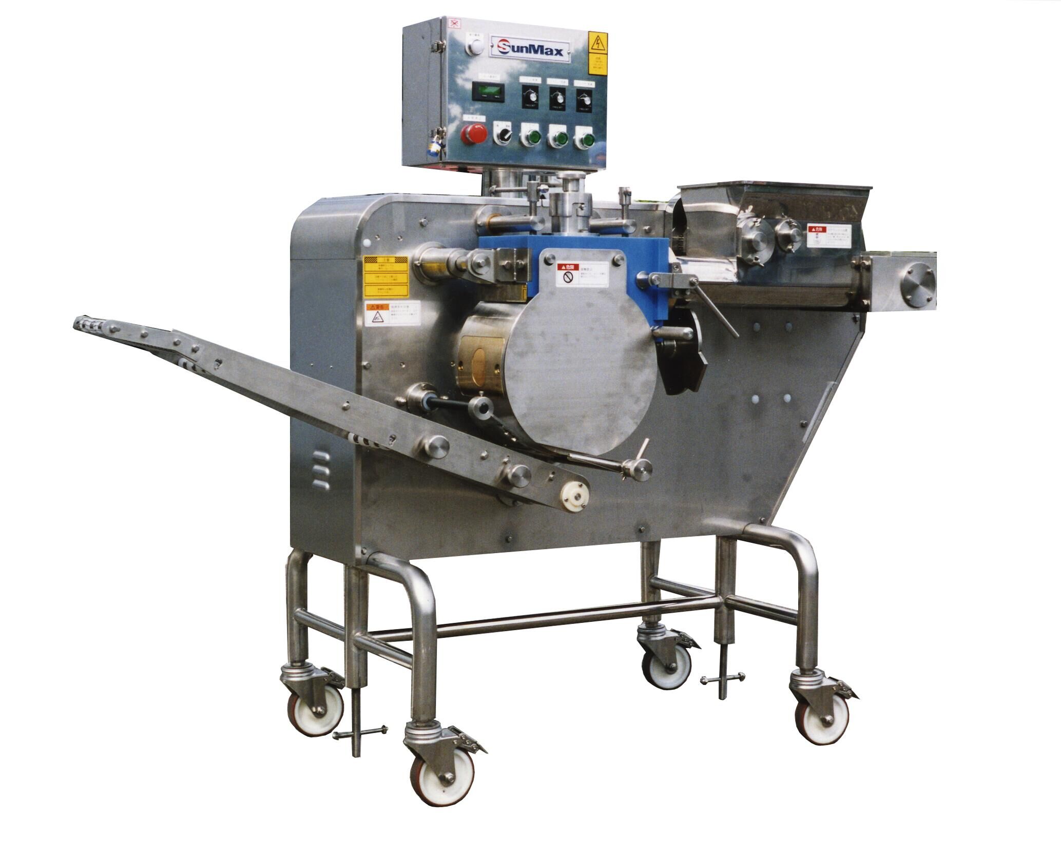 弊公司的成型机的成型原理是用螺旋缓慢挤压,物料在模具内成型,再用凸轮顶出来,钢琴丝剥离产品。非常适合作虾饼成型,不会挤碎虾仁。需要注意螺旋的速度和成型速度的匹配。螺旋推进的速度过快会挤碎虾仁。